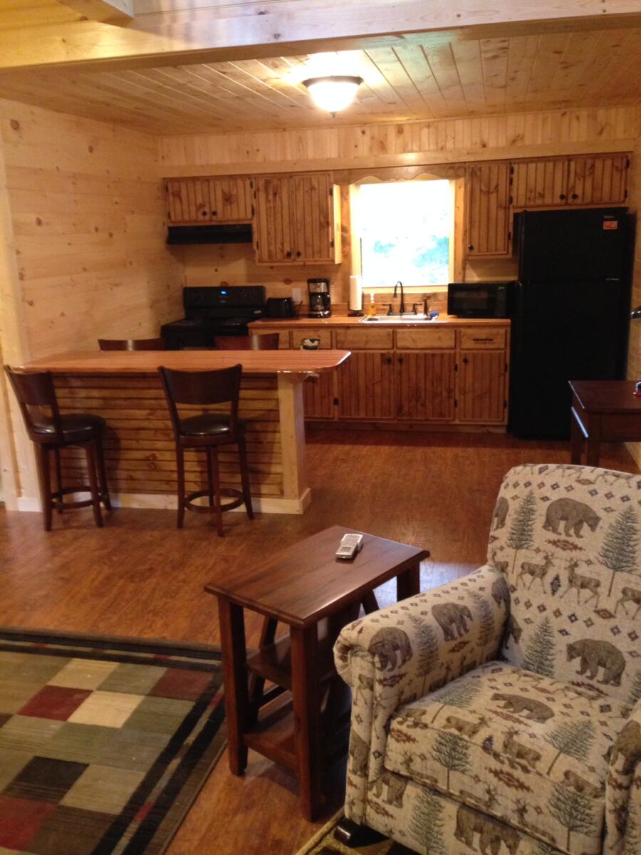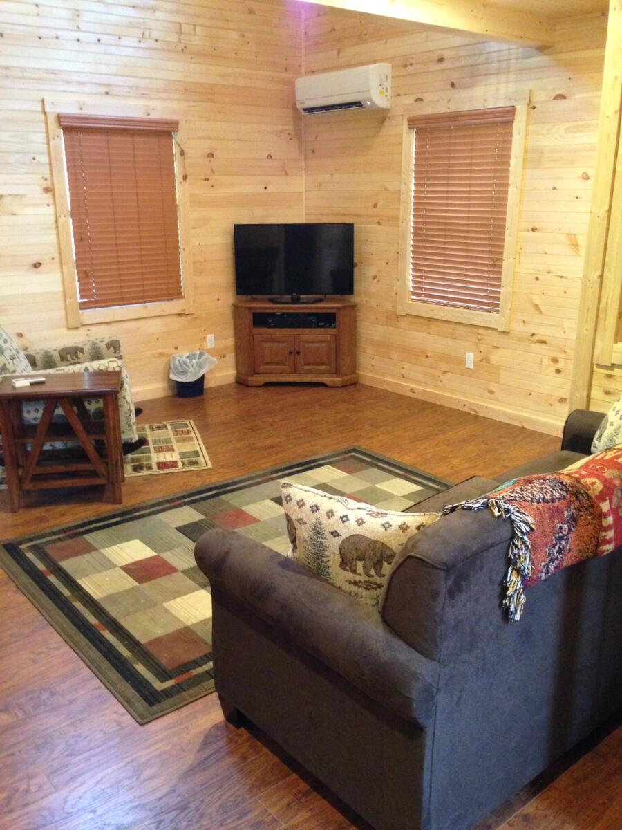 - Living room with 42″ TV and Blu-ray player, queen sleeper sofa, kitchen and full bath on mid-level