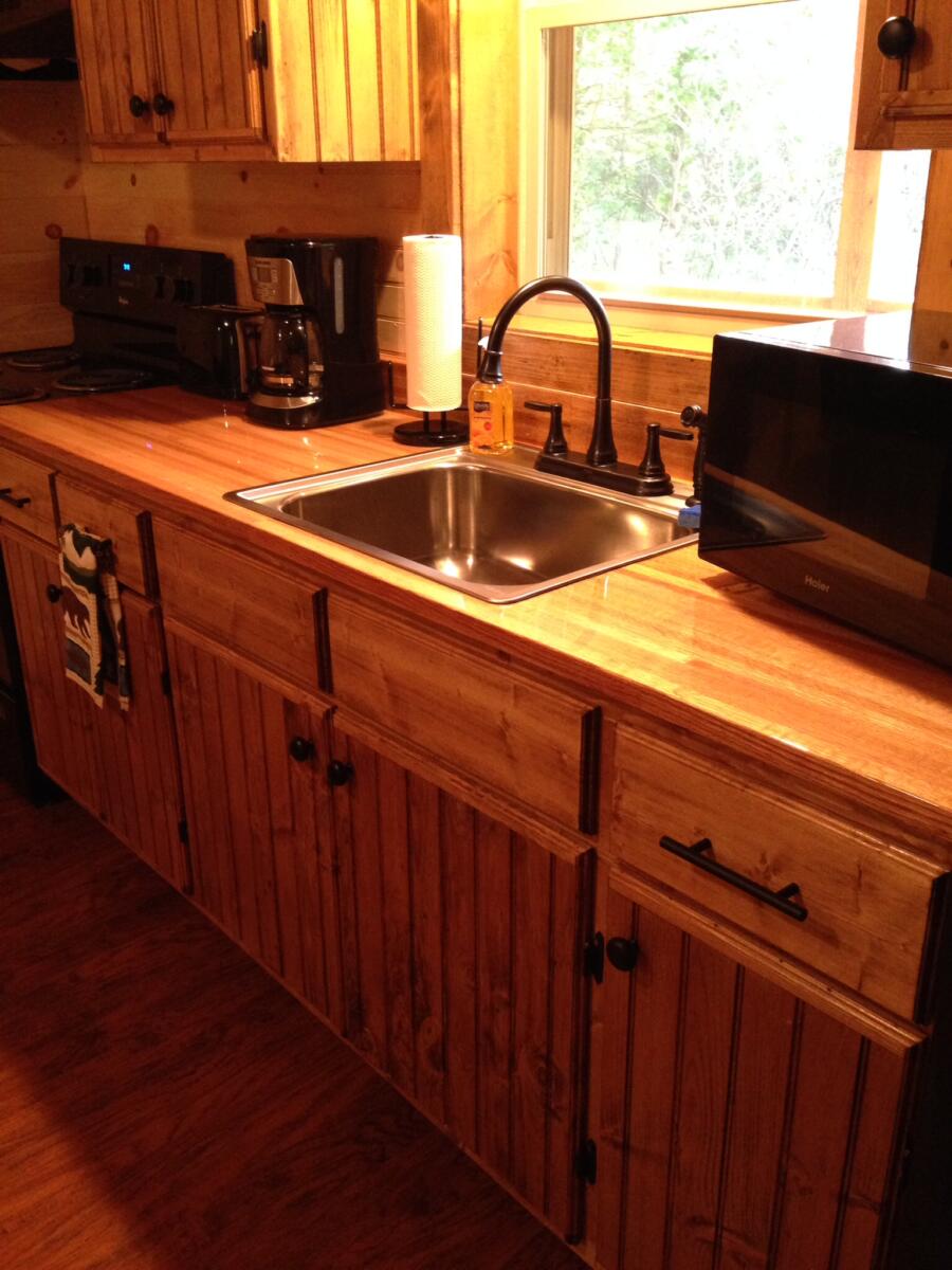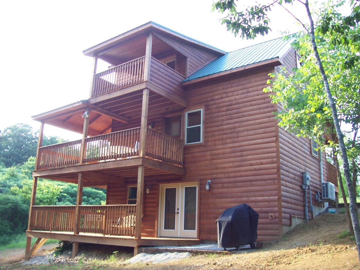 Hickory Haven is our 1300 square foot cabin that has three floors and 800 square feet of covered deck. The 2nd-floor bedroom features a queen bed, whirlpool soaking tub, electric fireplace, and balcony overlooking a scenic view of the woods. The main level has a living area with a sofa bed, tv, bathroom (soaking tub/shower), and kitchen. The basement level has a Murphy bed, bunk bed (full mattress on bottom), tv, and bathroom. The midlevel deck has a table/chairs, bench seat, and swing. The bottom level deck has a foosball table, bench seat, and a 6-person spa (with Bluetooth speakers). There is a fire pit, charcoal grill, and bench seating outside.